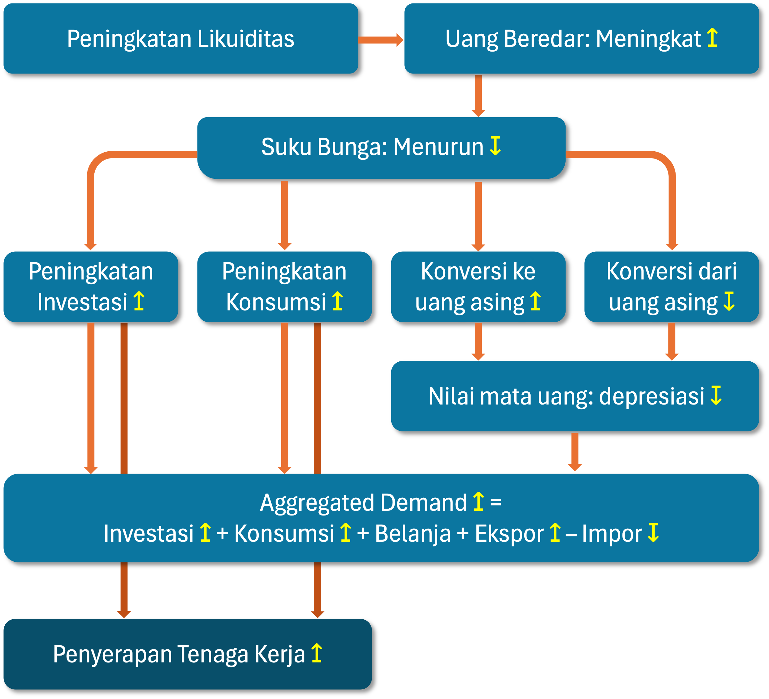 Saat pemerintah menambah uang ke pasar seperti ini, pelonggaran menambah likuiditas dan menurunkan suku bunga riil. Dengan bunga turun, orang lebih memilih belanja daripada menabung; juga orang lebih mudah meminjam untuk belanja konsumsi, tapi juga belanja produksi. Demand belanja naik, produksi naik, bisnis bergairah. Perusahaan menilai proyek dengan hurdle rate lebih rendah, sehingga investasi naik.